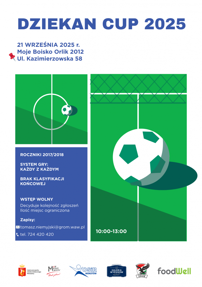 Zapraszamy na kolejną edycję DZIEKAN CUP. Turniej odbędzie się w niedzielę 21 września, na boisku OSIR MOKOTÓW przy ul. Kazimierzowskiej 58. Turniej rozpocznie się o godzinie 10.00 i potrwa do godziny 13.00. Jak co roku mamy przyjemność oragnizować to wydażenie przy współpracy z OSIR Mokotów oraz Urzędem Dzielnicy Mokotów