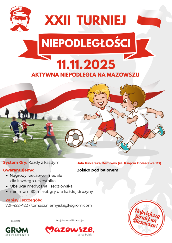 To wydarzenie to świetna okazja, aby dzieci mogły poczuć dumę z gry w biało-czerwonych barwach, rozwijać pasję do piłki nożnej oraz spędzić ten dzień w radosnej, rodzinnej atmosferze. Zachęcamy drużyny, trenerów i rodziców do wspólnego świętowania! Razem stworzymy piękną, sportowo-patriotyczną tradycję!