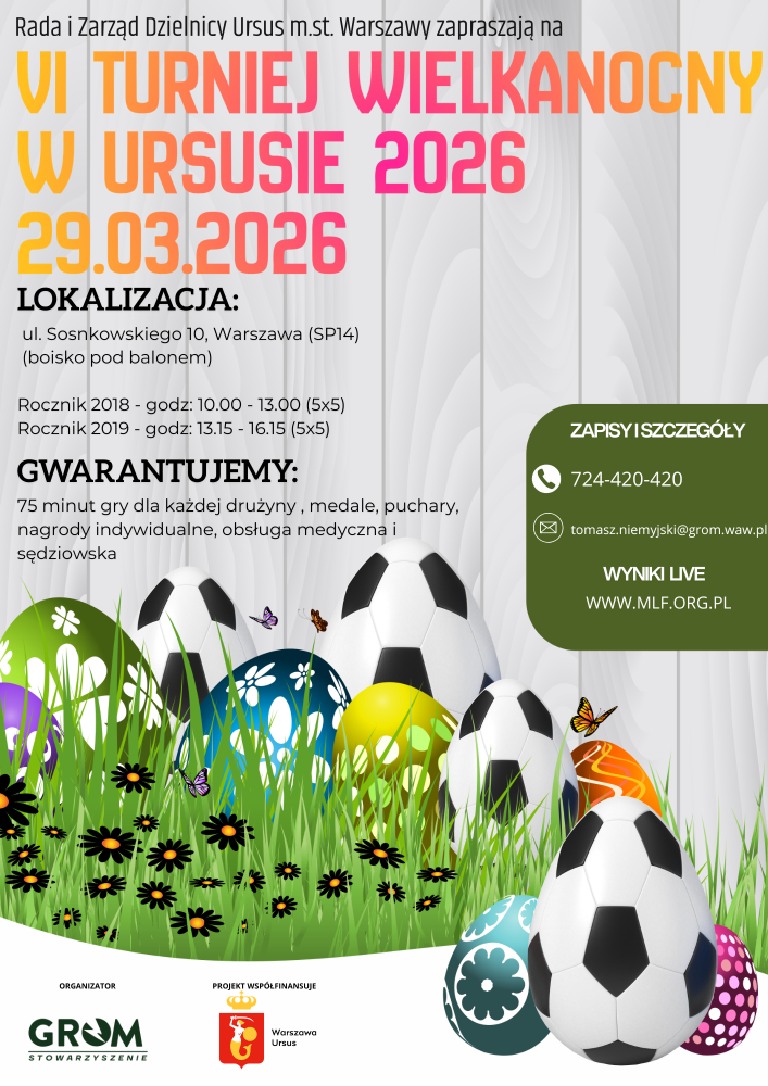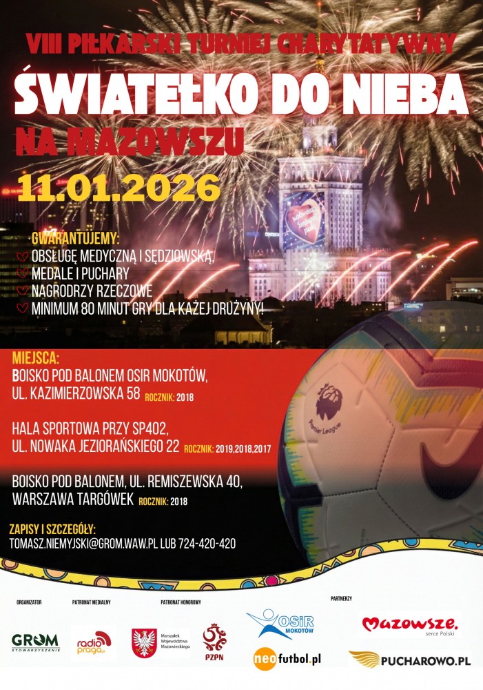 W ramach projektu Aktywna Niepodległa na Mazowszy organizowanego przez Stowarzyszenie GROM. Zapraszamy młodych fanów futbolu na wyjątkowy turniej, podczas którego sportowe emocje połączą się z uczczeniem rocznicy odzyskania przez Polskę niepodległości.